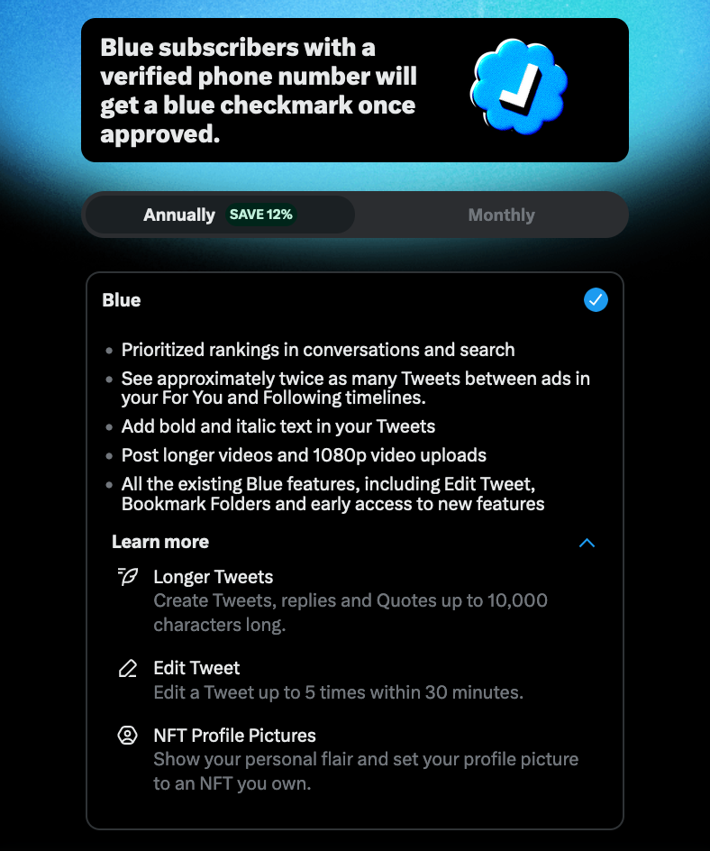 The blue check is the first step in Elon's plan to bring the chinese social credit score system to the west. Users who verify their identity are rewarded with more reach and better tools than those that do not. Verified users are the main product of Elon's twitter - an extensive database of individuals and complete control of the tools he will slowly get them to rely on - it is easier to monetize cattle than free men.
