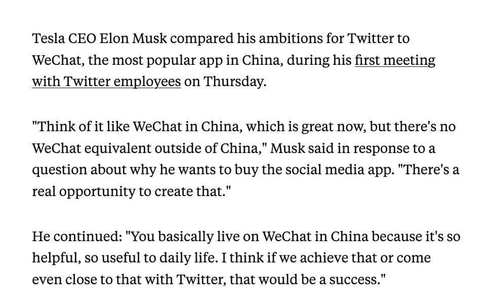 Why did Elon buy twitter for $44 Billion? What value does he see in it besides the greater influence that undoubtedly comes with controlling one of the largest social platforms in the world? We do not need to speculate - he made his intentions incredibly clear in his first meeting with twitter employees after his takeover - WeChat of the West.